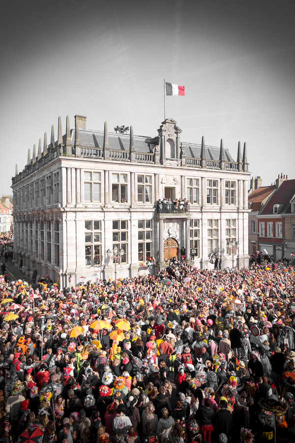 A la Mairie. Lancé de fromages et de saucisses locales à la mairie de Bergues, sur la foule déchaînée.