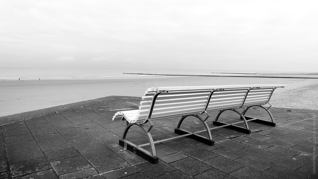 Face à la Mer.Un banc vide face a la mer du nord, la plage est vide et le ciel se couvre.