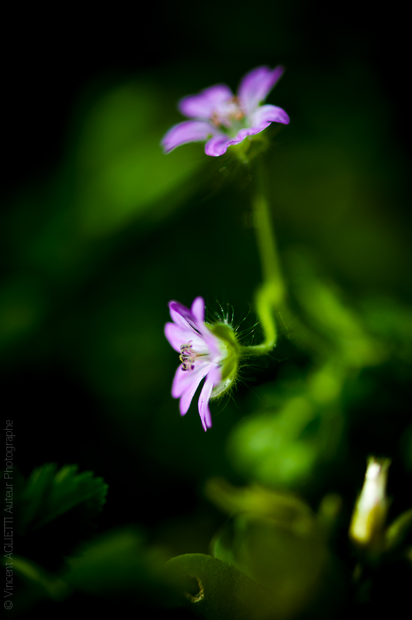 Mauve.Deux petites fleurs mauves sur fond noir.