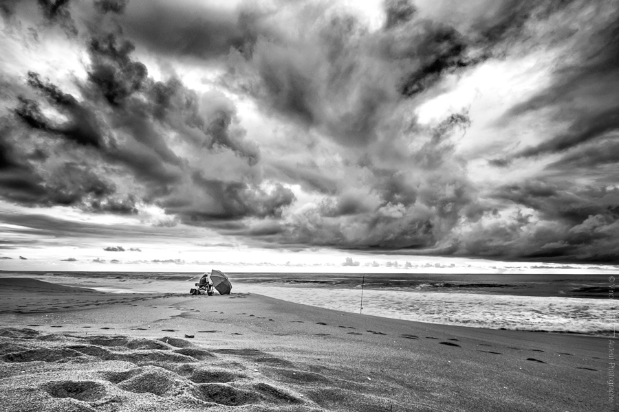 Seul au Monde. Un pêcheur solitaire sous un ciel menaçant.